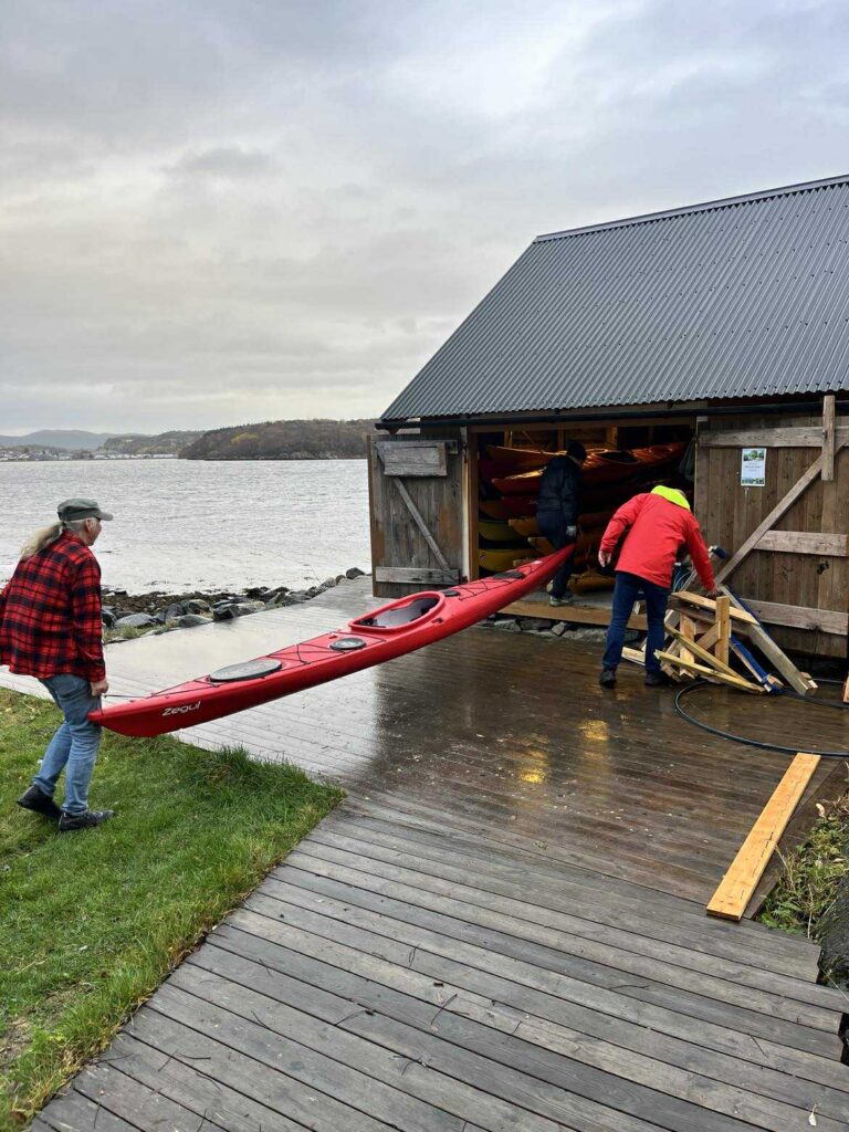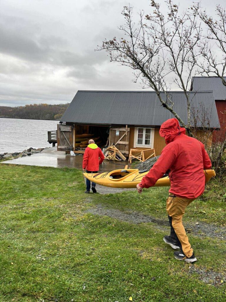 Det bæres kajakker inn i «Gul-brygga»